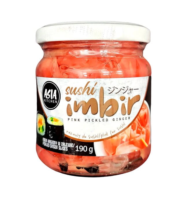 Ten delikatnie słodko-kwaśny imbir wyróżnia się subtelnym, różowym kolorem i cienkimi plasterkami, które łatwo wkomponować w różnorodne dania. Dodaje potrawom głębi i aromatu, a jednocześnie wspiera trawienie, łagodząc mdłości.