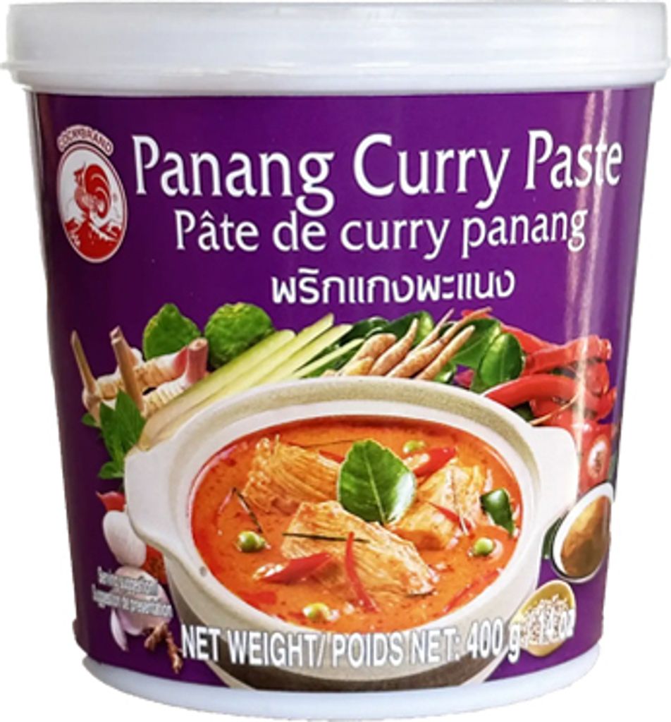 mąka kukurydziana, woda, pasta curry Panang (woda, pasta z czerwonego curry, sól, trawa cytrynowa, galangal, czosnek, chili, kumin, kolendra, sól, cukier, ocet ryżowy, olej roślinny, sól, przyprawy), mleko kokosowe, sól, cukier, przyprawy.